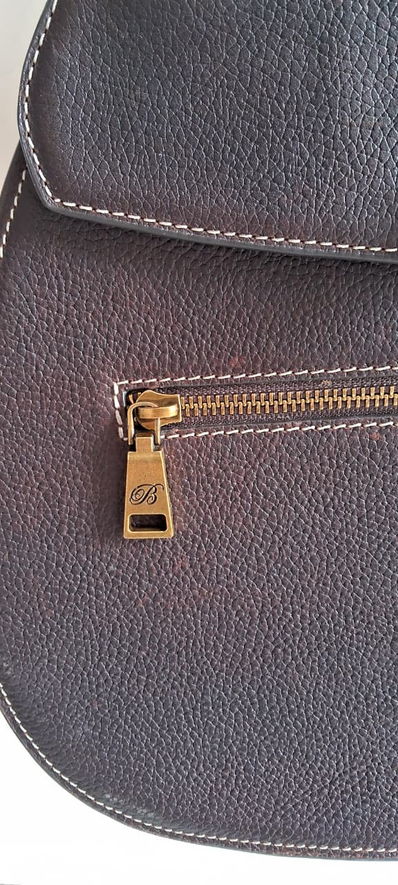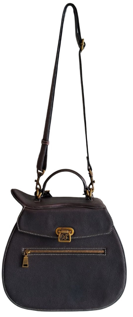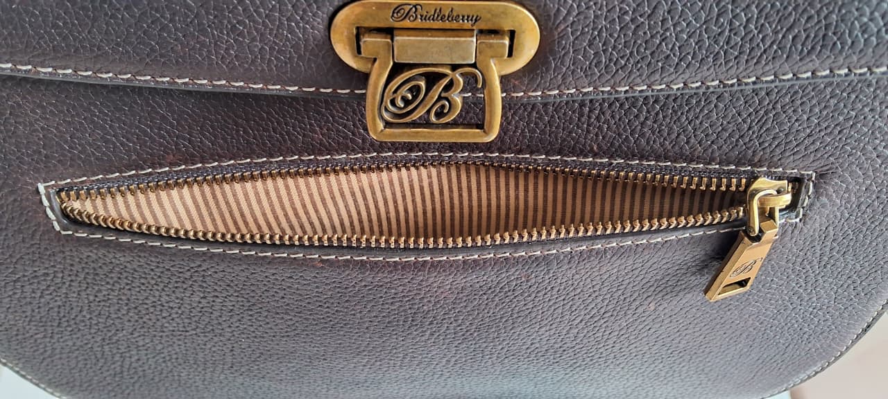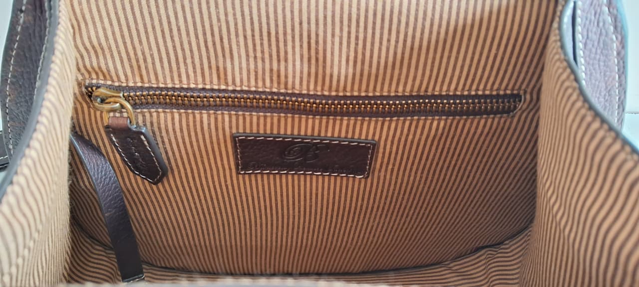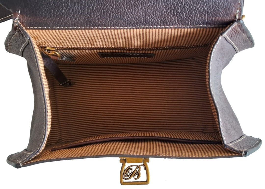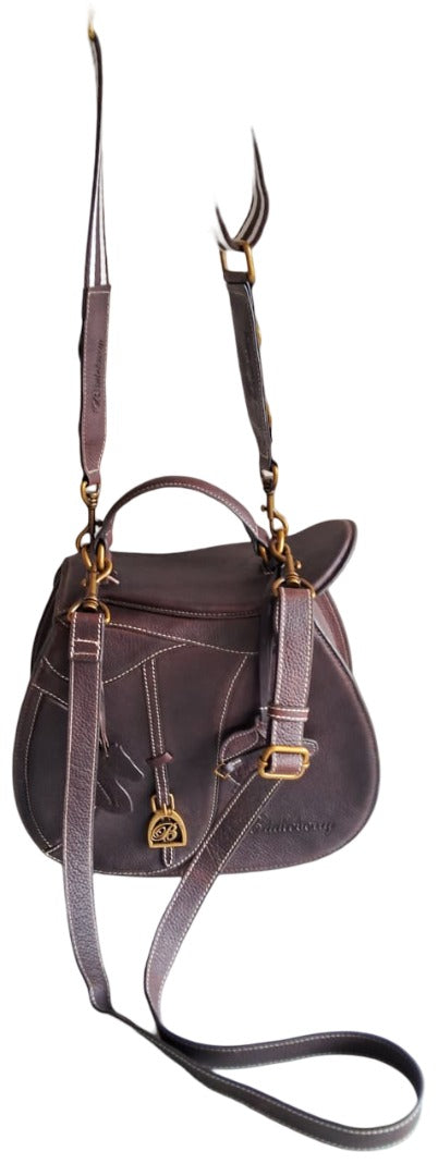 Capture the spirit of the stable with this exquisite designer Bridleberry "Mini Lexington" handbag. It is the sister to the Mini Devon, perfectly blending equestrian heritage with luxury craftsmanship. This distinctive bag is crafted from the highest-quality, full-grain vegetable-tanned leather, offering a rich texture and exceptional durability that will develop a beautiful patina over time. Its unique saddle-bag silhouette is a true conversation starter, paying homage to classic riding gear. Key Features: Premium Leather: Made of full-grain vegetable-tanned leather in a sophisticated dark brown hue with a beautiful pebbled texture. Equestrian Design: The bag's distinctive shape evokes a classic saddle. Designer Hardware: The closure is accented by a striking, antique brass tone stirrup-shaped buckle engraved with the Bridleberry B logo. Charming Accents: Playful leather details include a Bridleberry horse head charm and saddle charm reinforcing the theme. Versatile Carrying: Equipped with a short top handle for classic grab-and-go style, and a detachable, adjustable crossbody/shoulder strap for comfortable, hands-free wear. The crossbody strap features a sporty striped design with accent horse bits Practical Size: Generous dimensions of 9.5" wide x 7.5" tall x 4" deep make it ideal for carrying daily essentials without being bulky. Secure Closure: The flap closes securely with 2 magnetic snaps , revealing a well-organized interior. A zippered pocket is visible under the flap for quick access to essentials. This Mini Lexington is the perfect accessory for the equestrian enthusiast or anyone who appreciates luxury leather goods with a truly unique, theme-driven design.