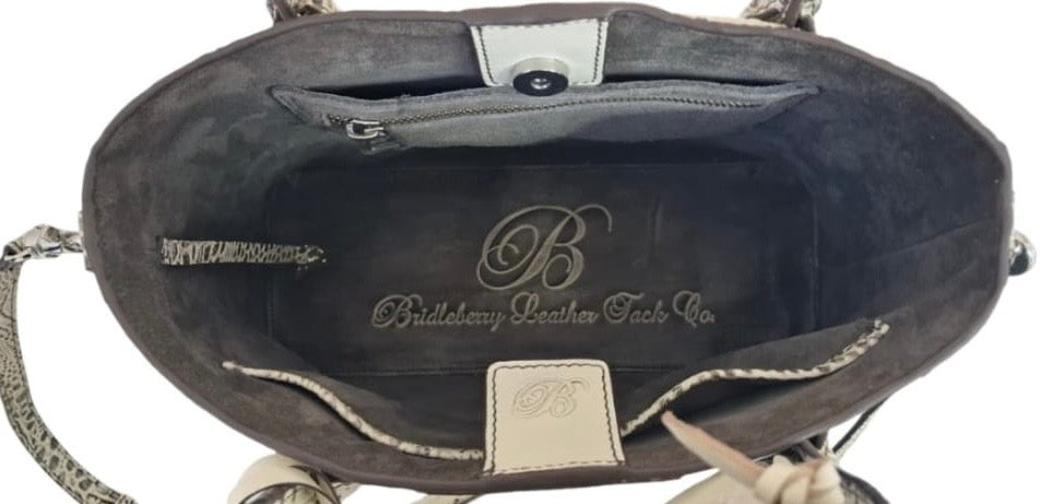 ​Open the bag to find a sumptuous suede lining that cradles your belongings. The thoughtful design includes a signature Bridleberry Leather Tack Co embossed leather bottom, confirming the bag’s authenticity and commitment to quality add this piece to your collection and carry a piece of equestrian elegance wherever you go.